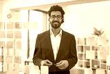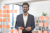 An Indian businessman wearing a headset smiles while standing in front of a glass wall with sticky notes