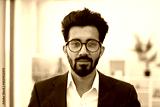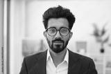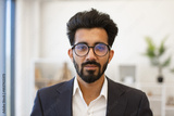 This portrait features a handsome Indian businessman with a beard and glasses, looking directly at the camera