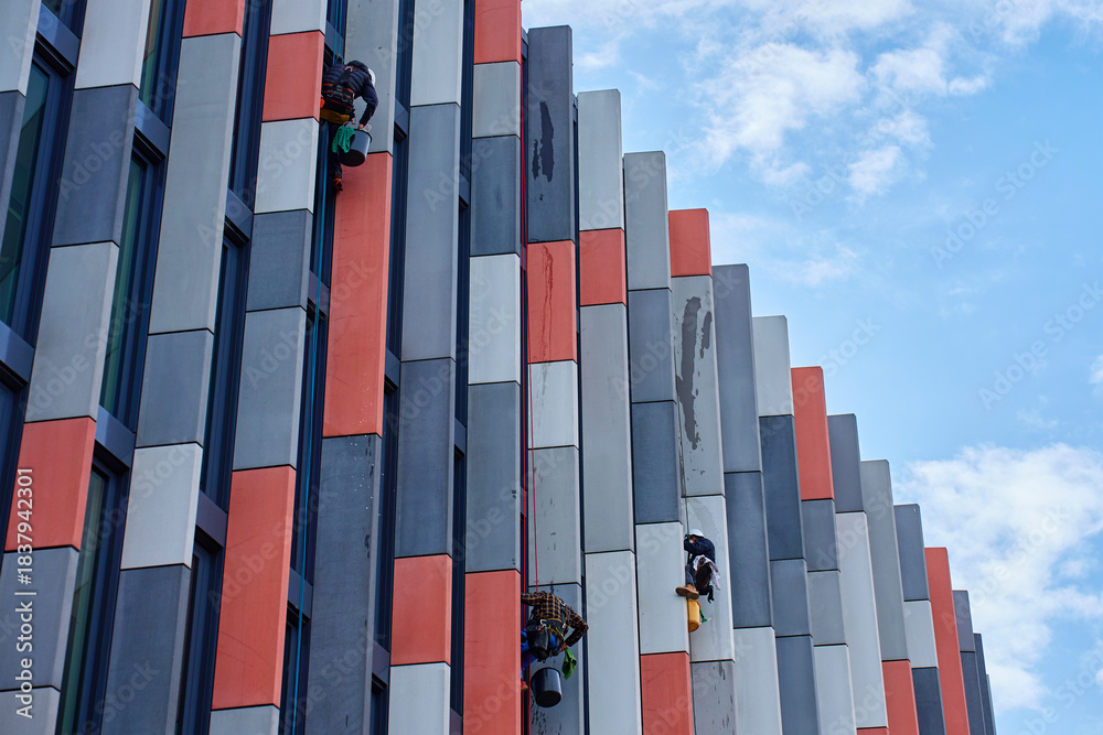 Window washers cleaning windows on modern office building facade. High rise window cleaners using rope access. Industrial alpinists washing exterior of skyscraper. Dangerous risky work at height