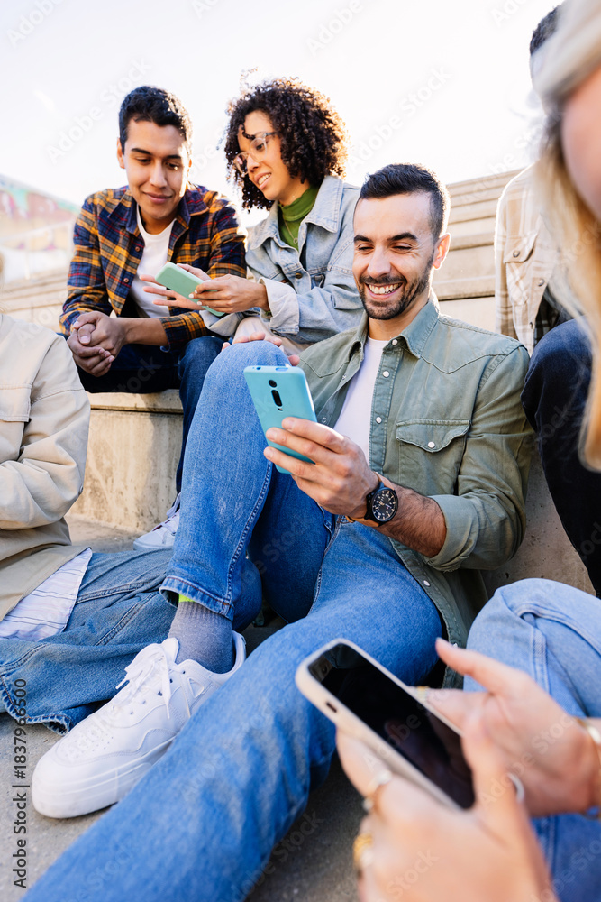 Young diverse students sitting together on university steps while using their mobile phones and sharing moments of connection. Friendship and education lifestyle.