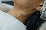 Side close-up of a facial skincare treatment on the neck area during a beauty procedure in a clinic