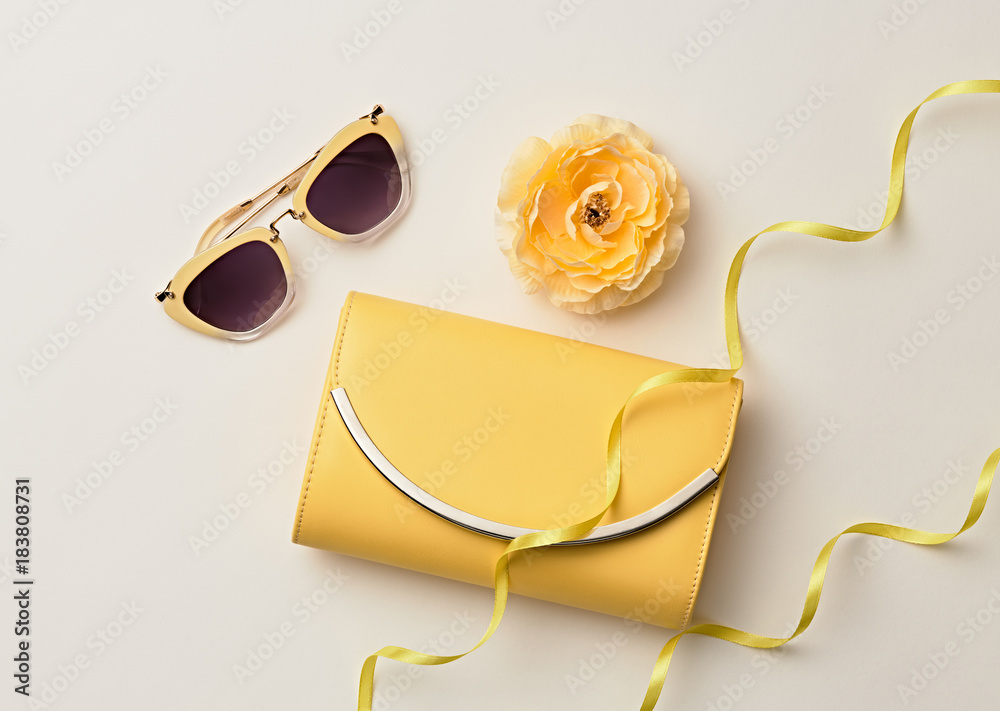 Fashion Woman Accessories Set. Pastel Color. Flat lay. Trendy fashion Yellow Handbag Clutch, Glamour Sunglasses. Flower. Luxury Spring lady. Art Design. Minimal Style