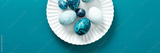 Colorful blue Easter eggs are artistically arranged on a white plate resting on a vibrant teal surface, capturing the essence of spring festivities and holiday traditions, banner