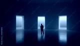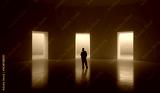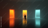 Clean composition. Man observing three bright doorways in wide minimal hall. Concept of decision-making, product pathways, UX flow design, marketing metaphors, self-growth and choice themes.