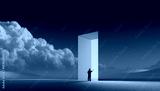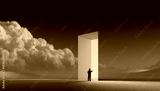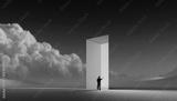 Digital artwork. Man facing glowing orange portal in wide landscape with clouds. Concept of branding identity, AI-driven creativity, strategic decision-making, educational themes, future design visual