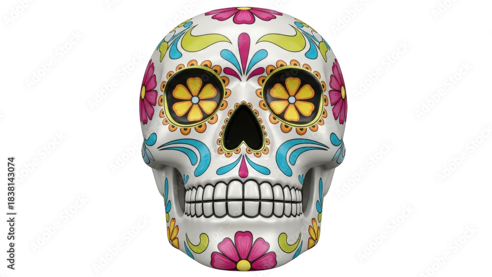 Isolated sugar skull decoratively painted, Day of the Dead remembrance cultural icon artwork