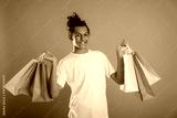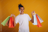 Bunch of shopping bags are in hands. Young guy is against yellow background