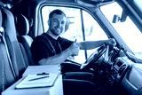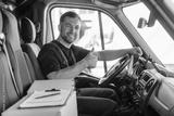 Document lying down on the box. Inside of the bus with delivery service man in uniform