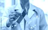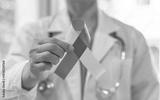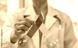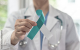 Teal and white ribbon for cervical cancer awareness month in January and HPV prevention with bow on medical doctor's hand support