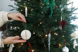 Hands hanging modern paper bauble, ribbons and star on stylish christmas tree, close up. Decorating xmas tree with ornaments and lights. Merry Christmas and Happy Holidays!