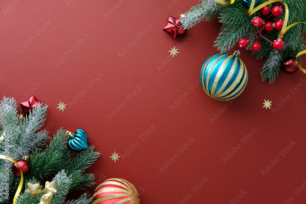 Simple Christmas flat lay with corner arrangement of frosted pine, ornaments, and gold stars on red.