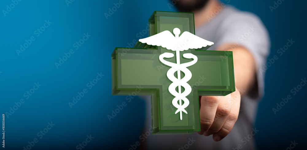 Close-up of a hand holding a green medical cross with a caduceus symbol. Represents healthcare, medicine, and