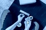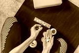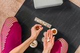 Closeup of young sporty woman putting pills into pill box for daily take. Active woman preparing weekly vitamins, pill organizer and supplement jars on yoga mat