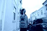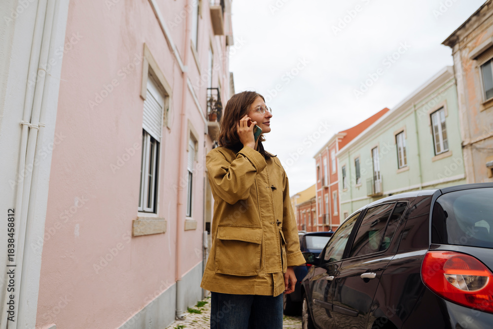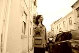 Businesswoman organizing site tour amidst city environment under cloudy sky