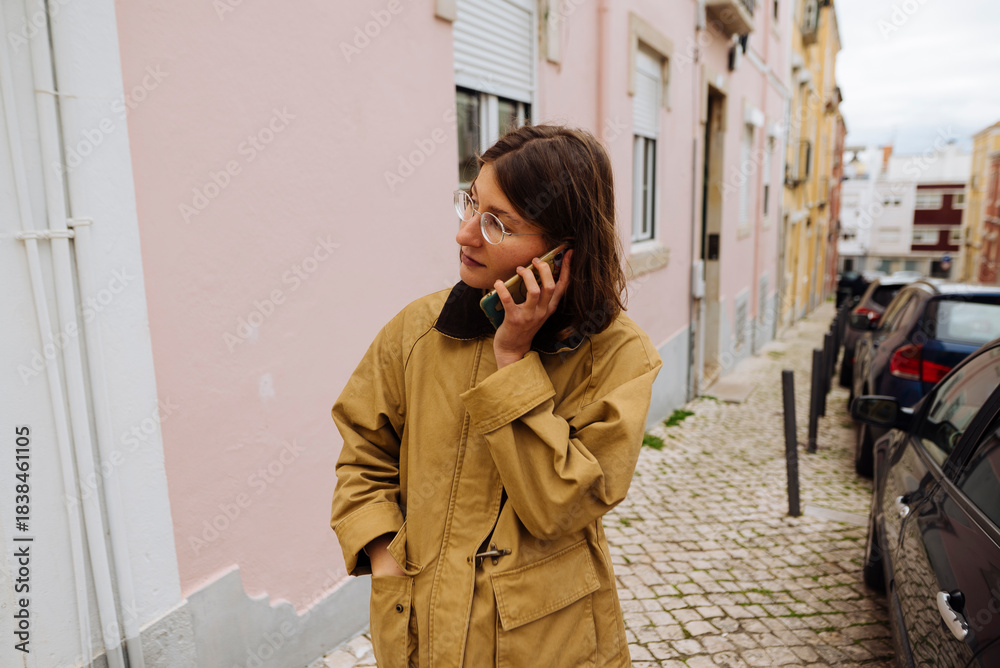Happy woman communicating, Casual woman on phone outside