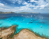 Aerial drone view of yachts and sailboats anchored in crystal clear turquoise sea near rocky coast. Scenic summer seascape in Mallorca, Balearic Islands, Spain. Mediterranean beach travel destination