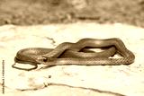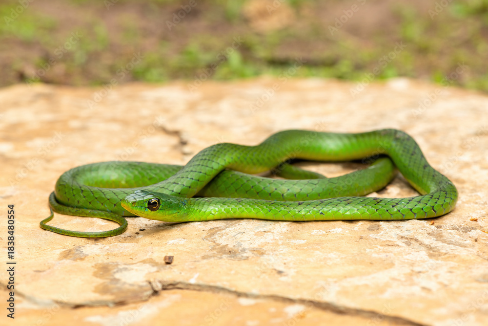 A cute eastern Natal green snake (Philothamnus natalensis) posed on a rock. A non-venomous southern African endemic snake