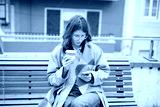 caucasian woman with coffee, student taking street-side study break