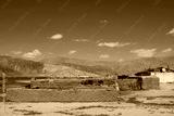 View of high-altitude Bulunkul village with building on toilet, surroundings with mountain background, near Bulunkul and Yashilkul lakes, Pamir Highway in Gorno-Badakshan, Tajikistan