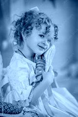 A charming 6-year-old blonde with curly hair in Christmas decorations