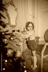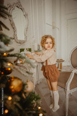 A charming 6-year-old blonde with curly hair in Christmas decorations