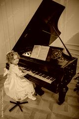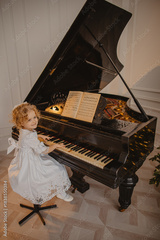 A charming 6-year-old blonde with curly hair plays the piano
