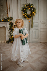 A charming 6-year-old blonde with curly hair in Christmas decorations