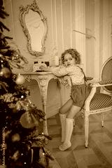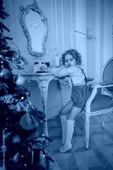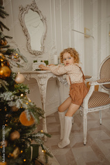 A charming 6-year-old blonde with curly hair in Christmas decorations