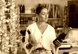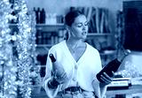 Young woman thoughtfully chooses champagne for Christmas dinner. A customer chooses a festive sparkling wine for New Year