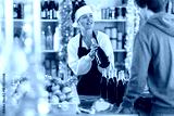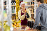 Female salesperson in Santa hat offers customer to buy champagne or sparkling wine for Christmas celebration