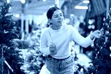 Young woman choosing a Christmas tree in a garden shop