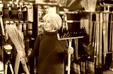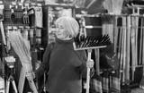 Senior woman in hardware store examines broom and besom. Client chooses and buys tool for sweeping and cleaning. Store visitor examines broom in detail before making purchase.