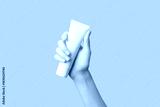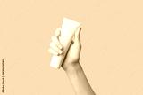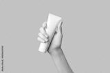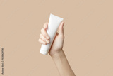 A womans hand holding a white cosmetic tube on a beige background. Care products