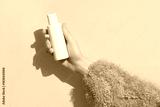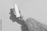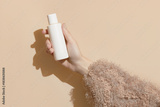 A womans hand in a sweater holds a bottle of cream on a beige background. Body care beauty treatment