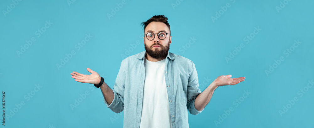 A man with glasses and a beard stands against a solid blue backdrop, shrugging his shoulders with a confused expression. He is dressed casually in a light shirt and t-shirt.