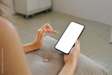 Woman hands holding and touching a modern smartphone with a blank white screen, using mobile technology indoors