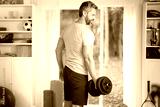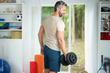 Middle-Aged Man Lifting Dumbbells at Home. Fit Latin Man Exercising with Weights. Mature Man with Dumbbells Indoors. Sport man Lifting Dumbbells. Morning Exercises. Training with Dumbbells.