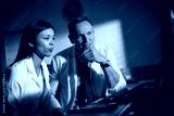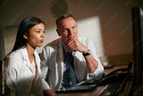 Night, doctor and people in hospital, coaching and planning with help, discussion and healthcare. Mentor, medical service or employees in clinic, coworking or support with online reading and talking