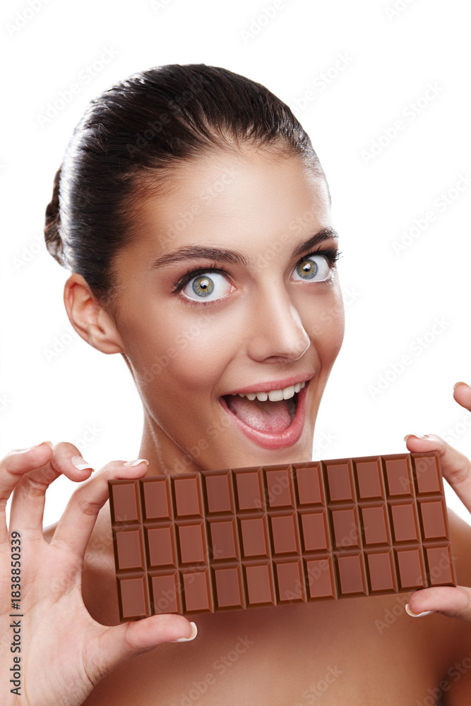 Chocolate, portrait and diet with woman in studio for antioxidants, sugar cravings or smile. Dessert, candy bar or cacao snack with excited person and food on white background for sweet and nutrition