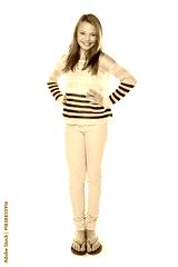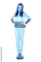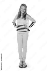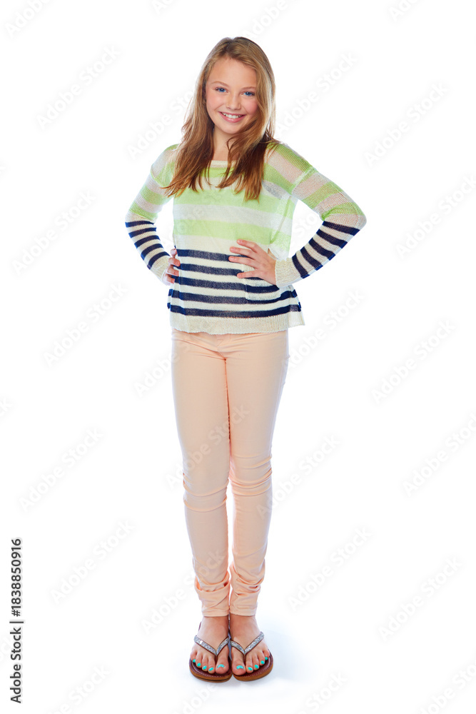 Happy girl, portrait or fashion with confidence for outfit or style on a white studio background. Child, kid or confident model with smile in clothing or striped jersey for childhood, youth or growth