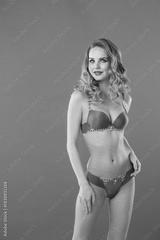 Woman with long curly blonde hair wearing a red lingerie set with white lace details, posing against a pink