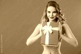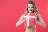 Woman with long curly blonde hair wearing a red lingerie set with white lace details, holding a red gift box with a white ribbon, posing against a pink