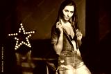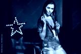 Woman with long brown hair wearing a blue denim shirt and shorts, posing with her hands on her hips next to a star-shaped light decoration, against a dark