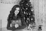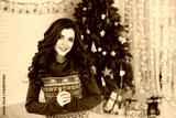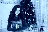 Woman with long brown hair wearing a blue sweater with a Christmas pattern, posing in front of a decorated Christmas tree with presents and lights
