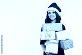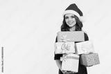 Woman with long brown hair wearing a red dress and a Santa hat, holding a stack of pink and white gift boxes with blue and pink ribbons