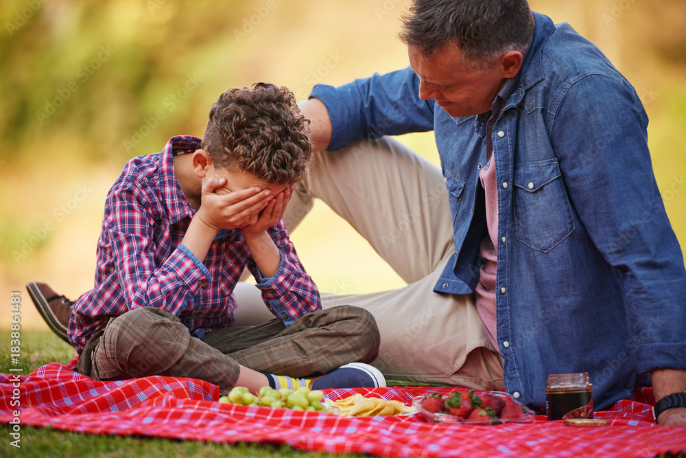 Sad, talking and dad with child at picnic for comforting, bonding and console for relationship. Family, empathy and father with boy for emotional support, upset and care for conversation outdoor