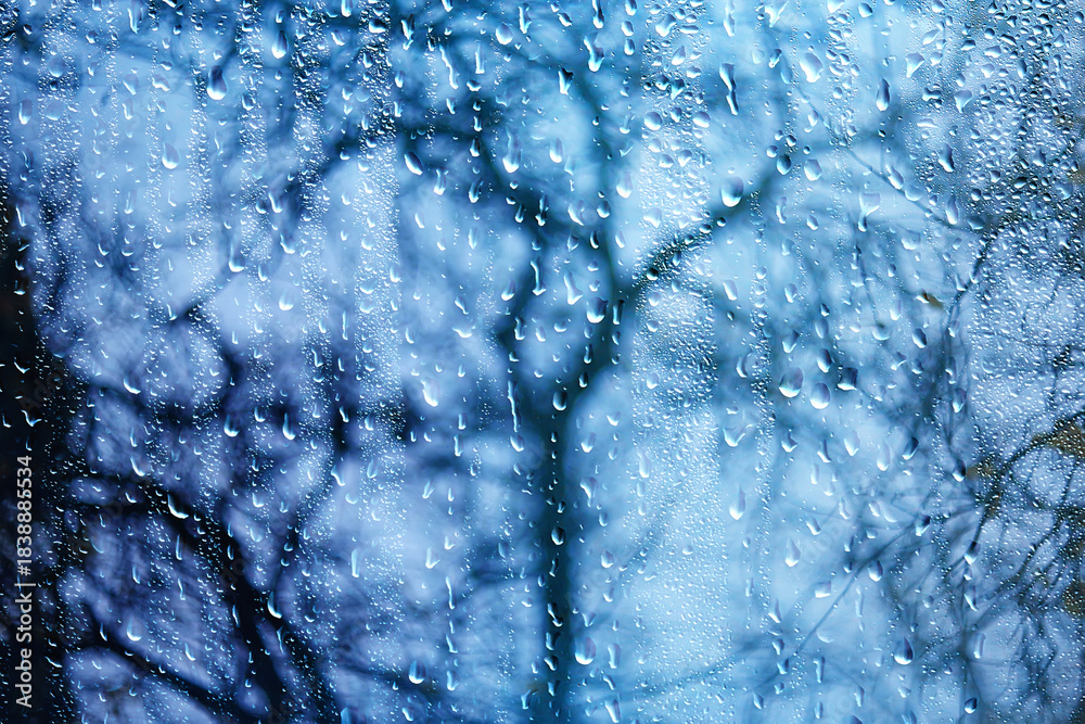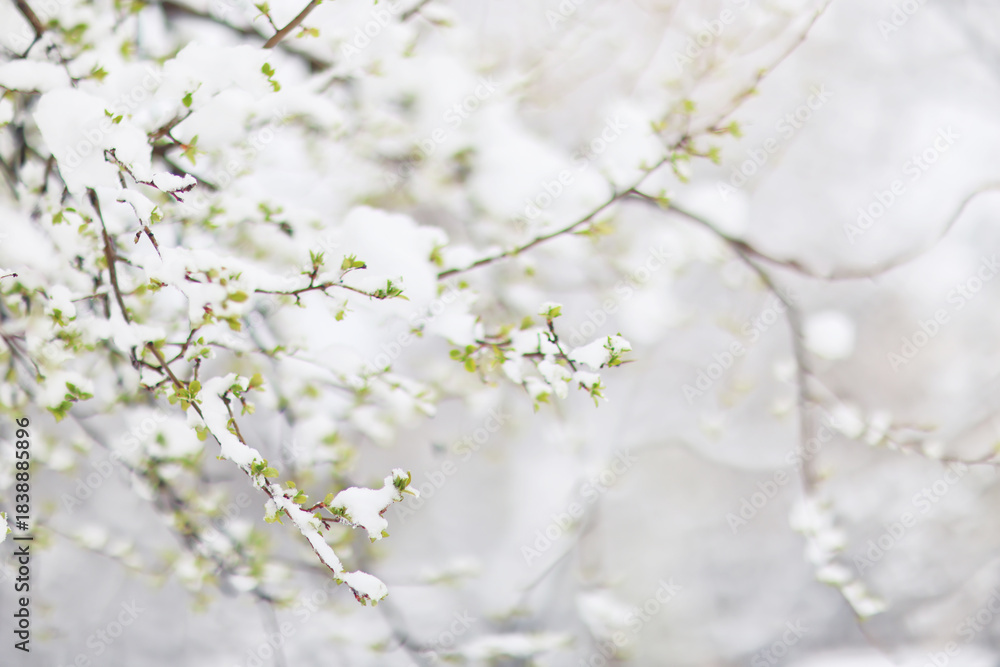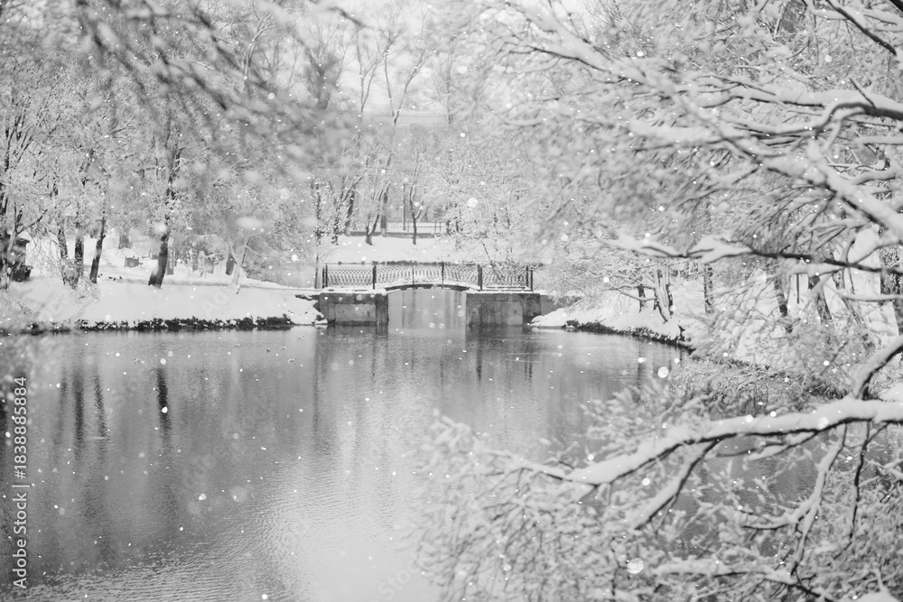 Snowfall in a winter park, landscape trees covered with snow, nature background, seasonal weather background