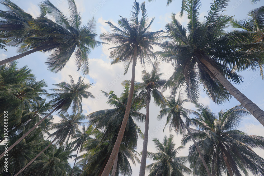 Coconut palms against the sky, tropical summer landscape, view from a southern vacation on the island