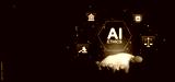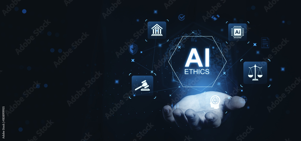AI ethics law concept with digital icons of justice and governance floating above a hand on futuristic holographic background in technology theme.