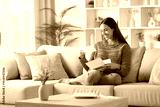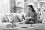 Happy woman in green reading check from letter at home